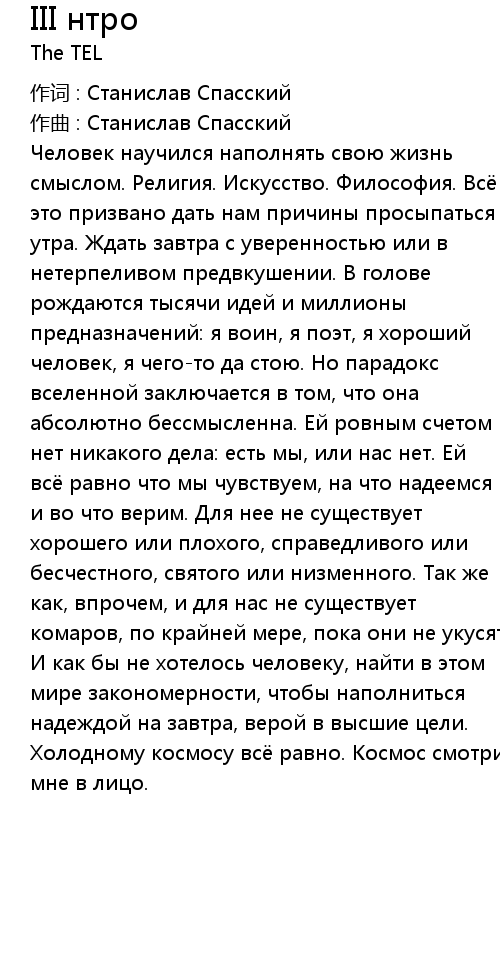 Человек научился наполнять свою жизнь смыслом. Религия. Искусство. Философия. Всё это призвано дать нам причины просыпаться с утра. Ждать завтра с уверенностью или в нетерпеливом предвкушении. В голове рождаются тысячи идей и миллионы предназначений: я воин, я поэт, я хороший человек, я чего-то да стою. Но парадокс вселенной заключается в том, что она абсолютно бессмысленна. Ей ровным счетом нет никакого дела: есть мы, или нас нет. Ей всё равно что мы чувствуем, на что надеемся и во что верим. Для нее не существует хорошего или плохого, справедливого или бесчестного, святого или низменного. Так же как, впрочем, и для нас не существует комаров, по крайней мере, пока они не укусят. И как бы не хотелось человеку, найти в этом мире закономерности, чтобы наполниться надеждой на завтра, верой в высшие цели. Холодному космосу всё равно. Космос смотрит мне в лицо. |