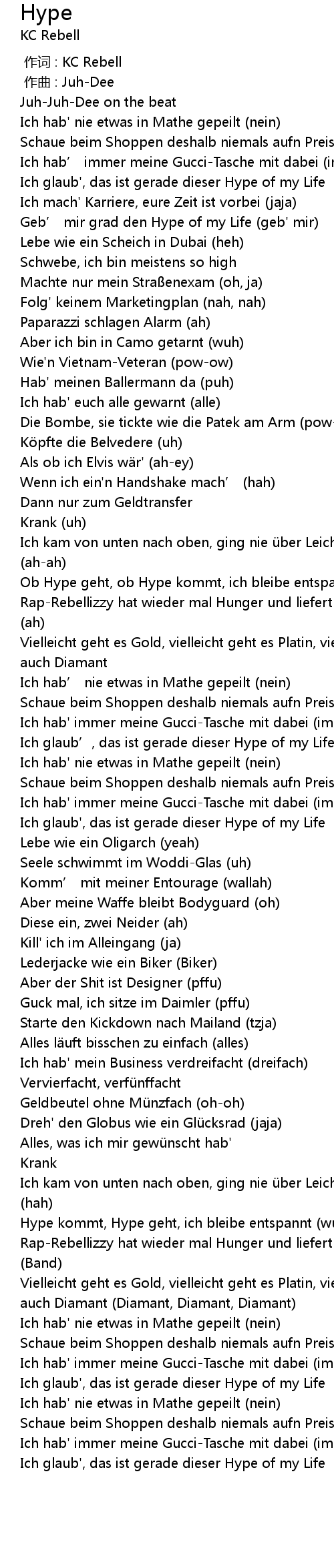 | [01:59.132] | Hype kommt, Hype geht, ich bleibe entspannt wuh |
