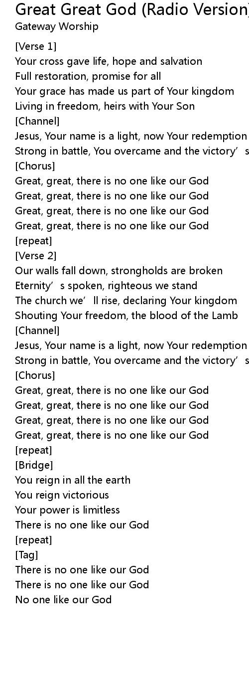 | Strong in battle, You overcame and the victory' s ours, now we sing | |