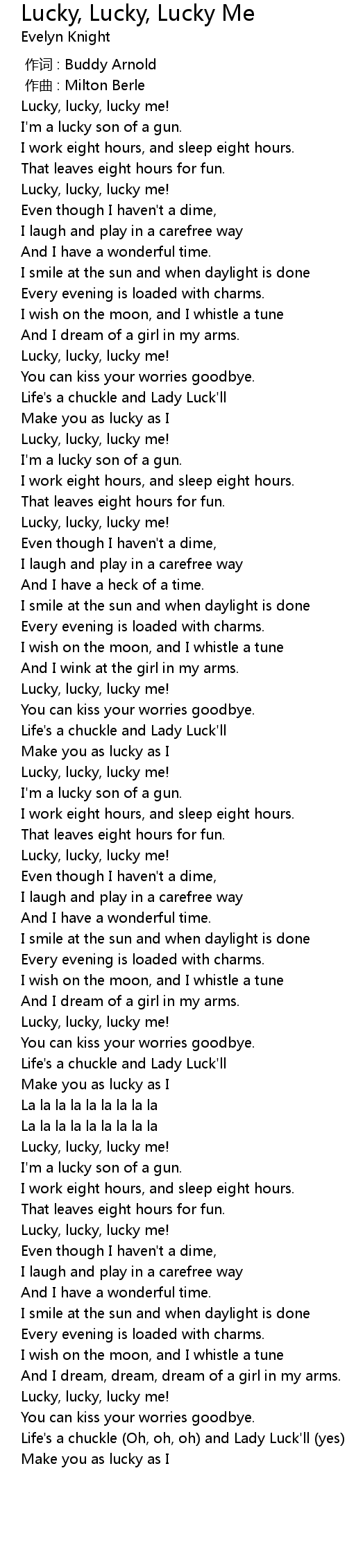 | [02:24.21] | Lucky, lucky, lucky me! |