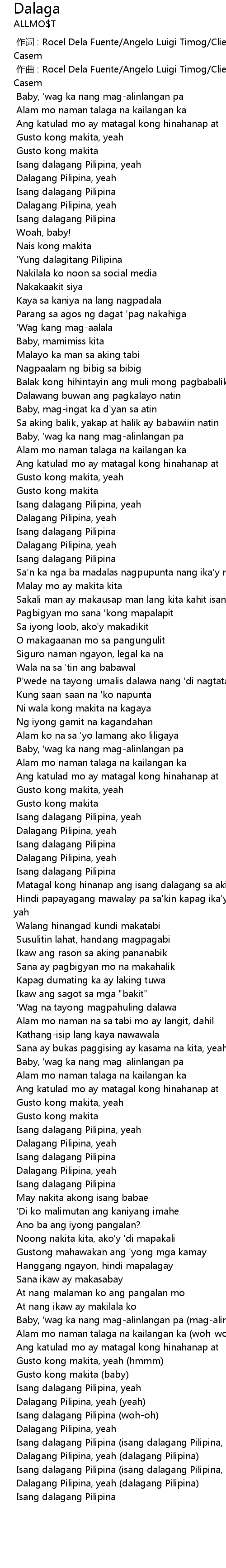 | [00:00.000] | 作词 : Rocel Dela Fuente/Angelo Luigi Timog/Clien Alcazar/Jomuel Casem |