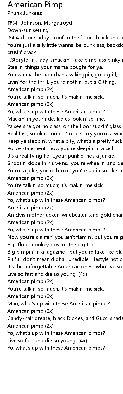 | You' re just a silly little wannabe punkass, backdoor, truckstore, cowboy crusin' crack... | |
