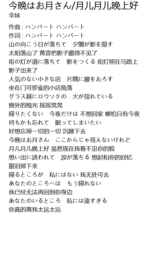 | [02:03.777] | 今晩はお月さん ここからじゃ見えないけれど 月儿月儿晚上好 虽然现在我看不见你的脸 |