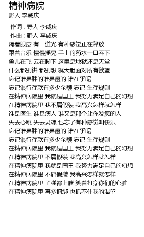 | [01:17.141] | 在精神病院里 我就是国王 我努力满足自己的幻想 |