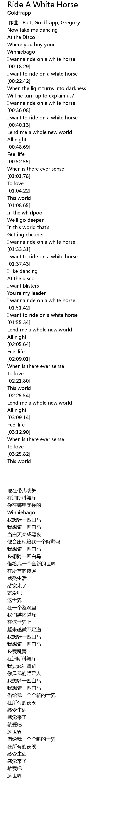 | [00:15.35] | I wanna ride on a white horse |