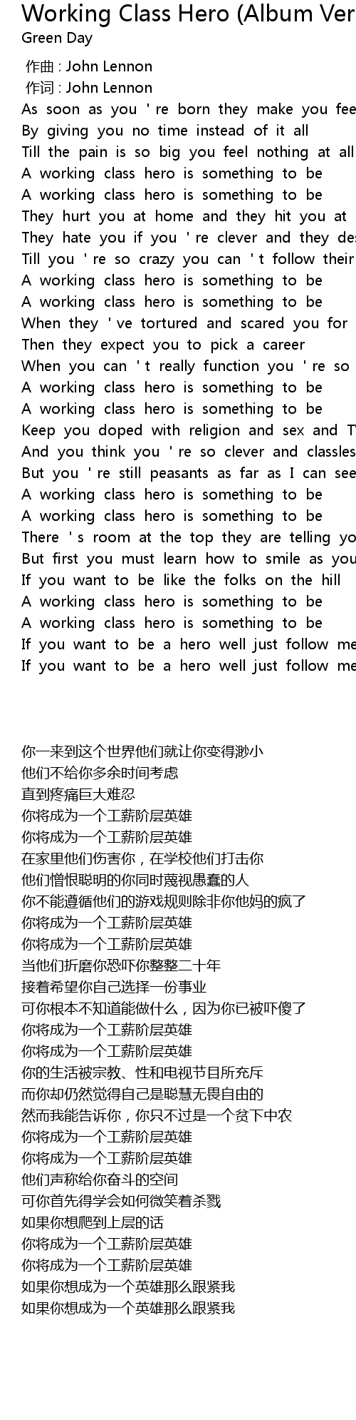 | [01:45.390] | A working class hero is something to be |