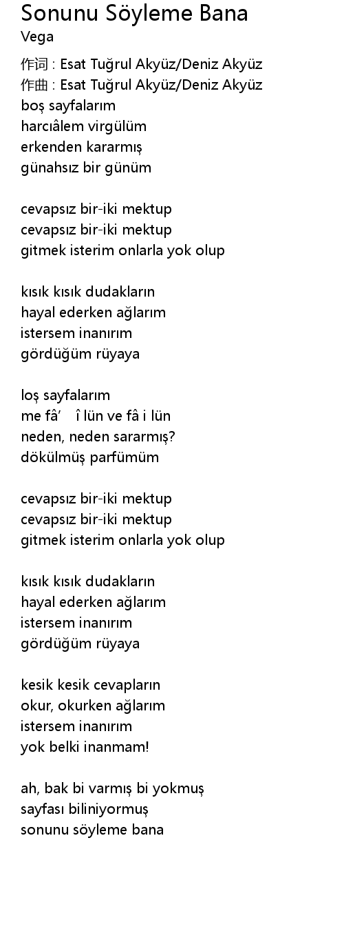 | 作词 : Esat Tuğrul Akyüz/Deniz Akyüz | |