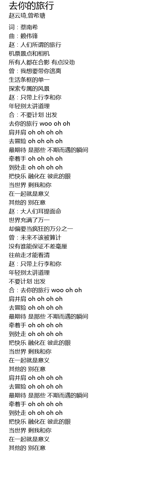 | hé: qù nǐ de lǚ xíng woo oh oh | |