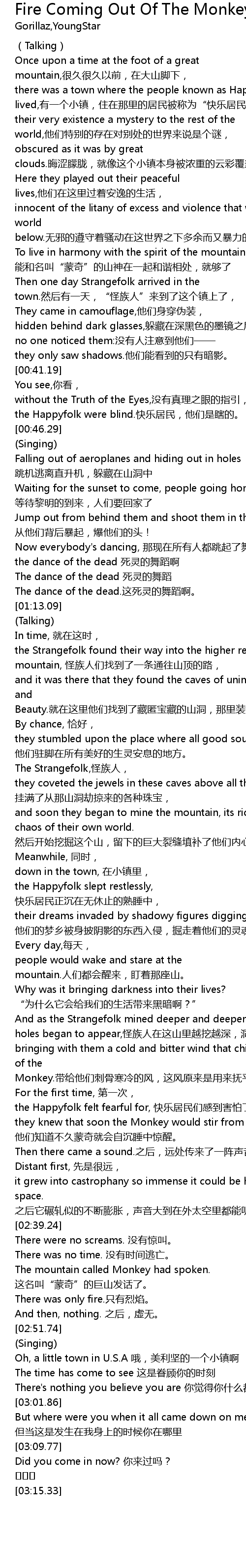 | [02:44.43] | The mountain called Monkey had spoken. zhe ming jiao" meng qi" de ju shan fa hua le. |