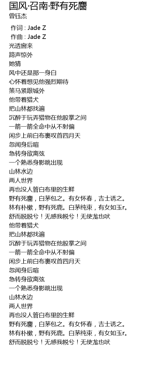 | [03:01.401] | 林有朴樕,野有死鹿。白茅纯束,有女如玉r。 |