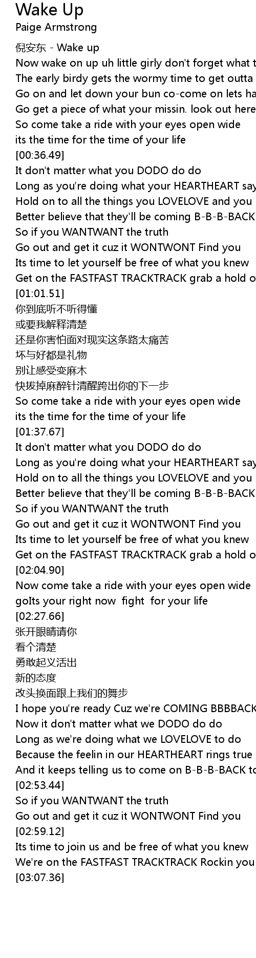 | [00:12.13] | Now wake on up uh little girly don't forget what they said |