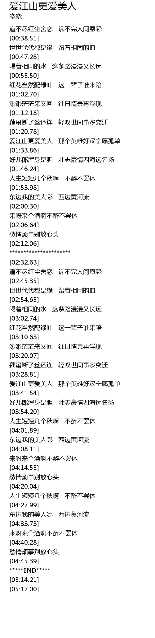 | [03:30.72] | 爱江山更爱美人 那个英雄好汉宁愿孤单 |