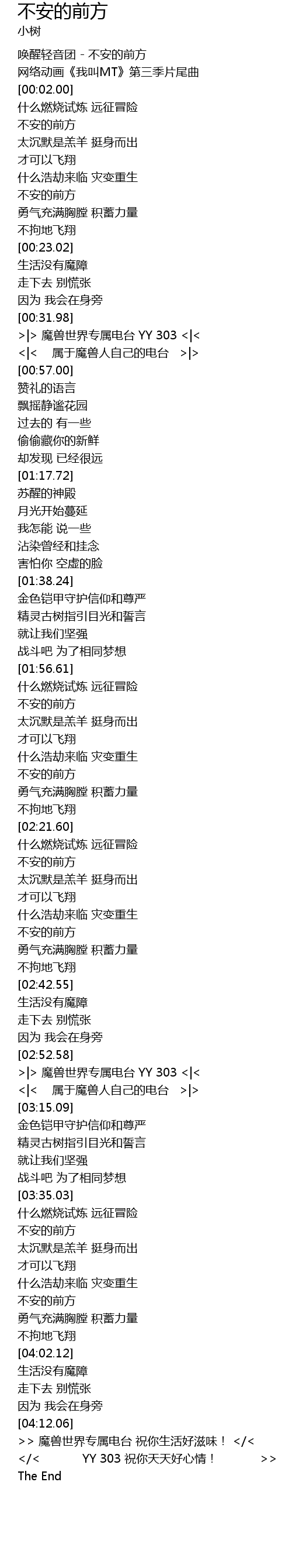 | [02:56.88] | >|> 魔兽世界专属电台 YY 303 <|< |