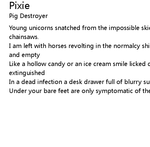 | Young unicorns snatched from the impossible skies precious horns, ordinary chainsaws. | |