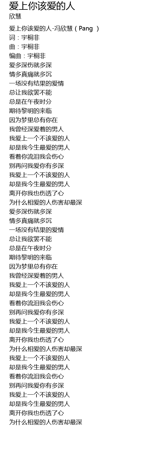 | [00:00.00] | 爱上你该爱的人-冯欣慧(Pang ) |