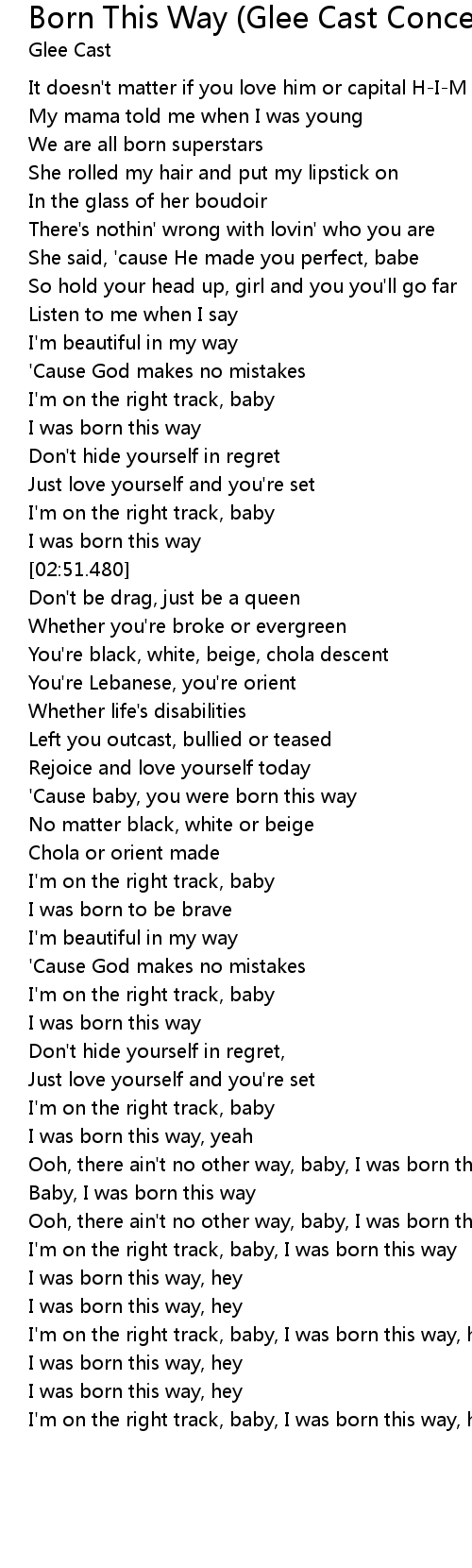 | [03:31.850] | Ooh, there ain't no other way, baby, I was born this way |