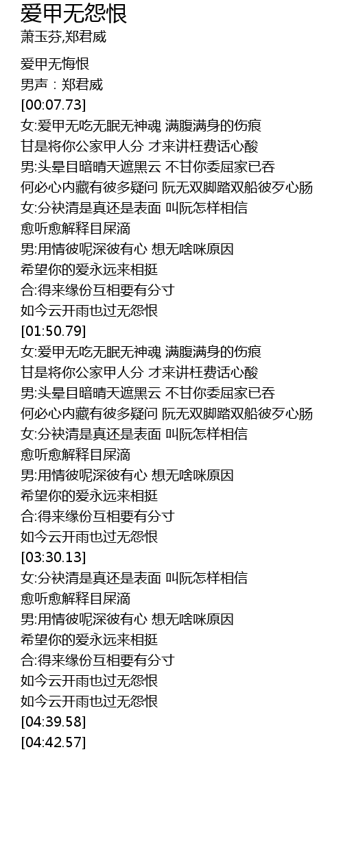 | [00:58.71] | 何必心内藏有彼多疑问 阮无双脚踏双船彼歹心肠 |