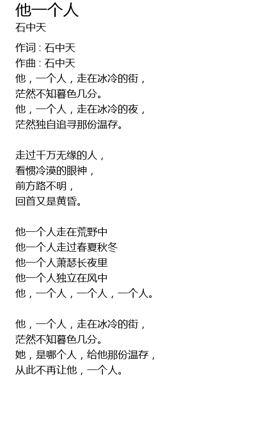 | tā, yí ge rén, zǒu zài bīng lěng de yè, | |