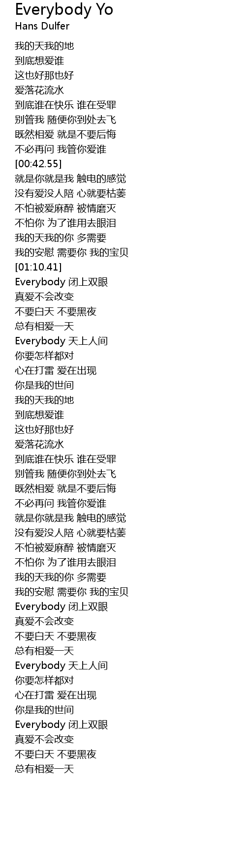 | [01:11.40] | Everybody bì shang shuāng yǎn |