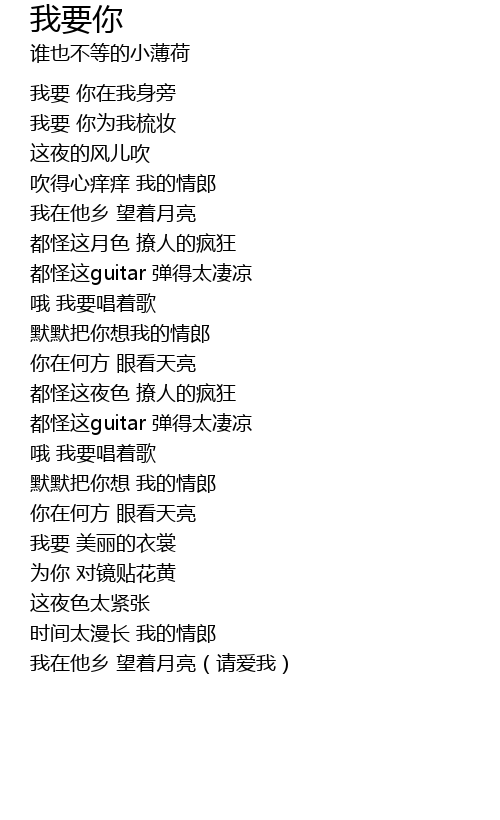 | [02:03.571] | 我在他乡 望着月亮(请爱我) |