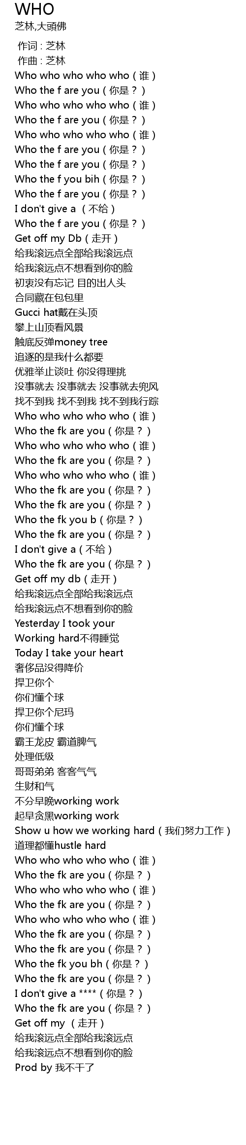 | [00:33.408] | Who the f you bih nǐ shì? |