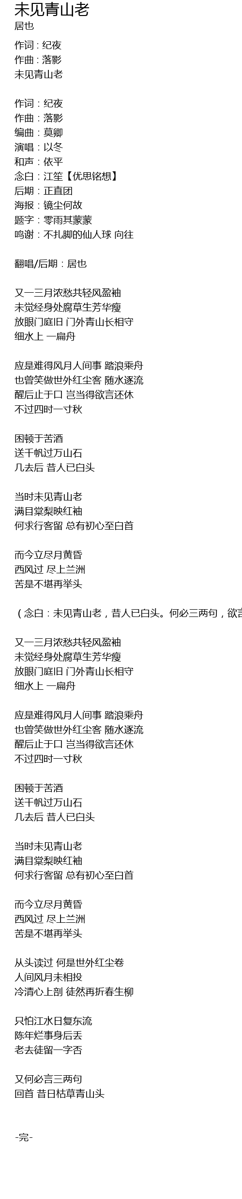 | niàn bái: wèi jiàn qīng shān lǎo, xī rén yǐ bái tóu. hé bì sān liǎng jù, yù yán yǐ hái xiū. | |