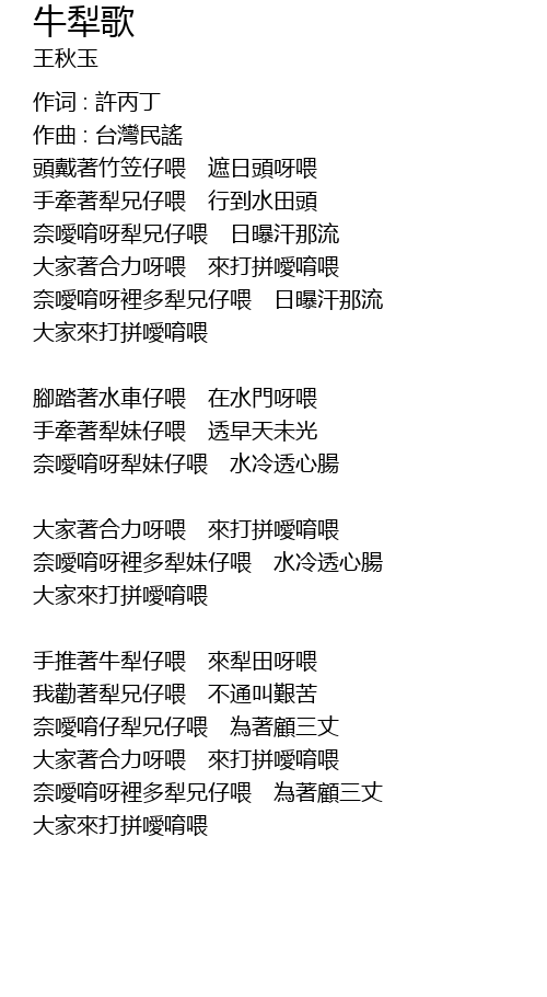 | 手推著牛犁仔喂 來犁田呀喂 | |