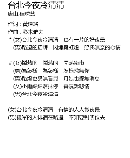 | (女)台北今夜冷清清 有情的人人賞夜景 | |