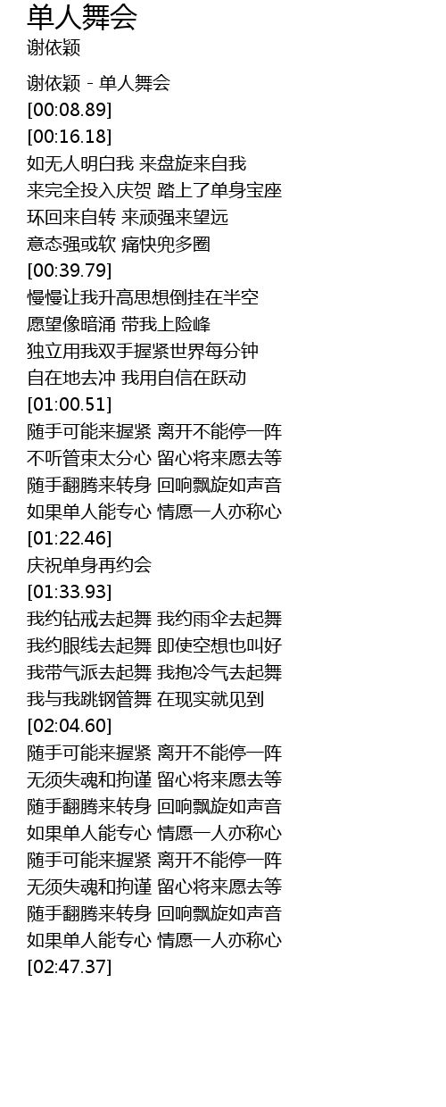 | [00:00.27] | 谢依颖 - 单人舞会 |