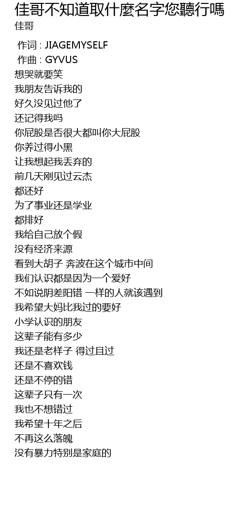 | [00:00.000] | 作词 : JIAGEMYSELF |