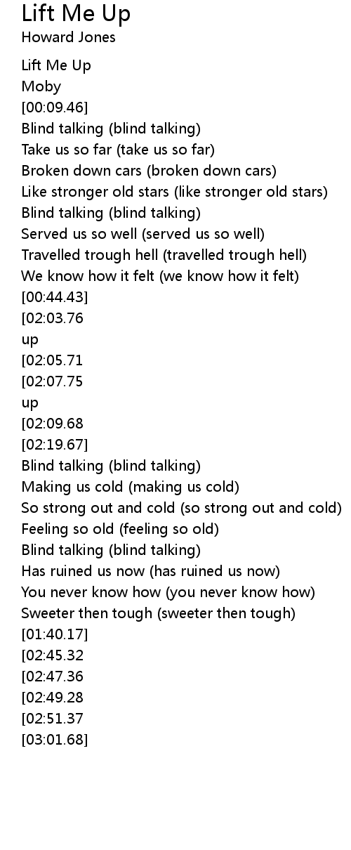 [02:11.69][02:03.76][01:56.06][01:47.90][01:00.24][00:52.40] Lift me up, lift me up