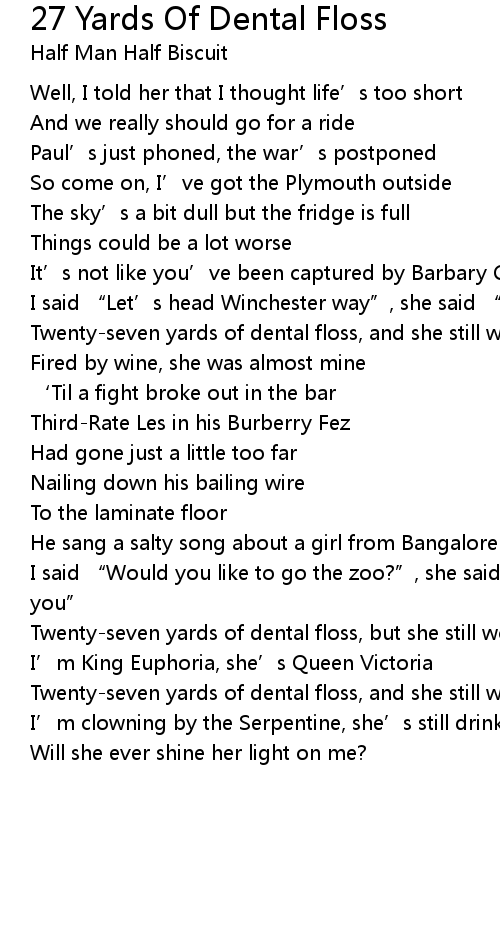 | Twentyseven yards of dental floss, but she still won' t give me a smile | |