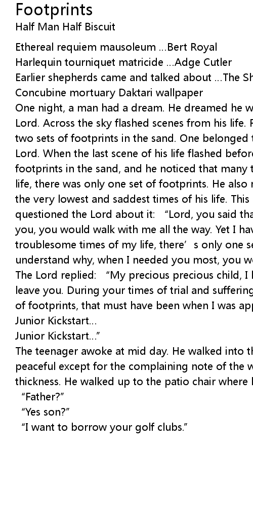 | The Lord replied: " My precious precious child, I love you, and would never leave you. During your times of trial and suffering, when you see only one set of footprints, that must have been when I was appearing on | |
