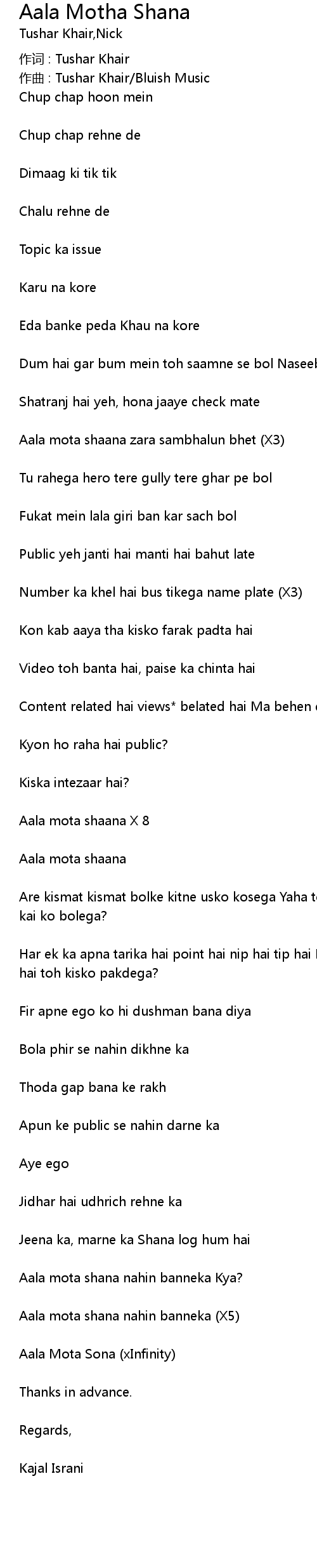| Are kismat kismat bolke kitne usko kosega Yaha toh sab bhai hai apne, Kis kis ko kai ko bolega? | |