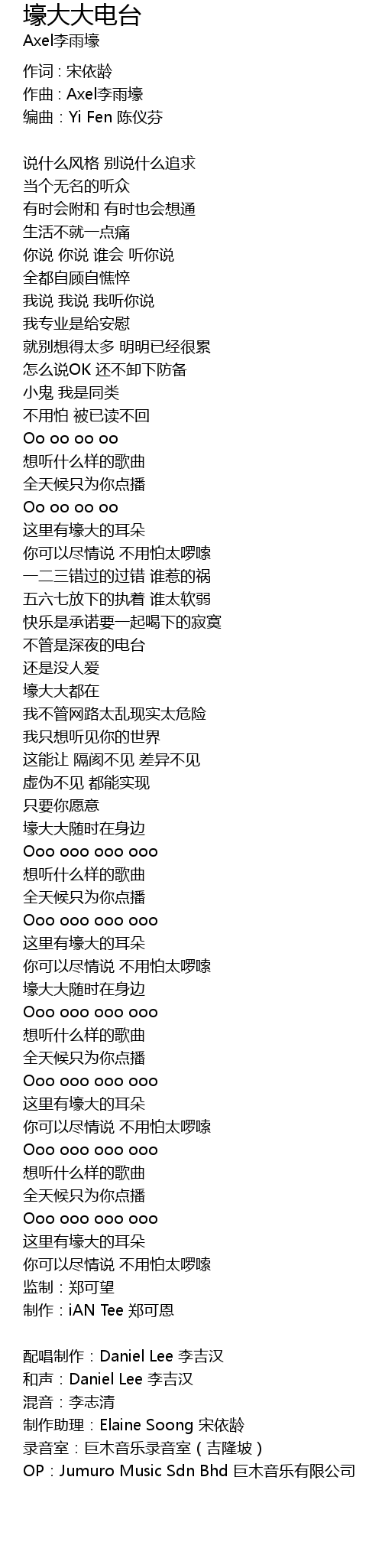 | 配唱制作:Daniel Lee 李吉汉 | |