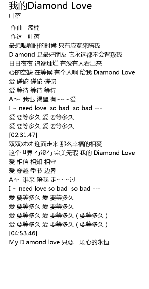 | [00:43.21] | 心的空缺 在等候 有个人啊 给我 Diamond Love |
