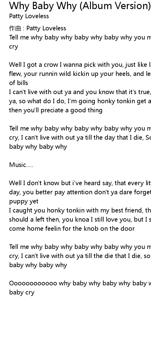 | Tell me why baby why baby why baby why you make me cry baby cry baby cry baby cry, I can't live with out ya till the die that I die, so tell me why baby why baby why baby why | |