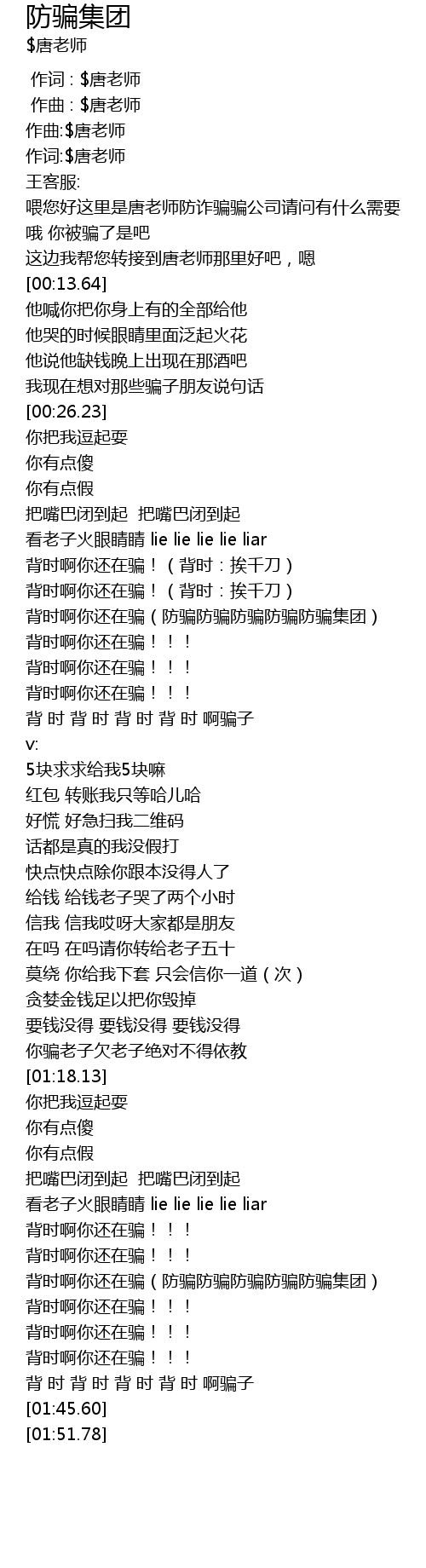 | [00:42.96] | 背时啊你还在骗(防骗防骗防骗防骗防骗集团) |