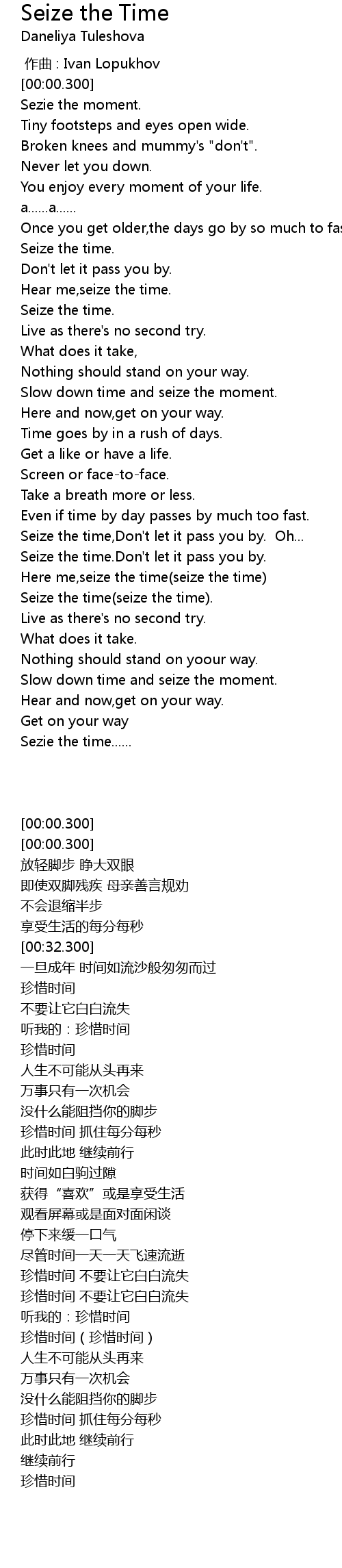 | [01:58.300] | Seize the time. Don' t let it pass you by. |
