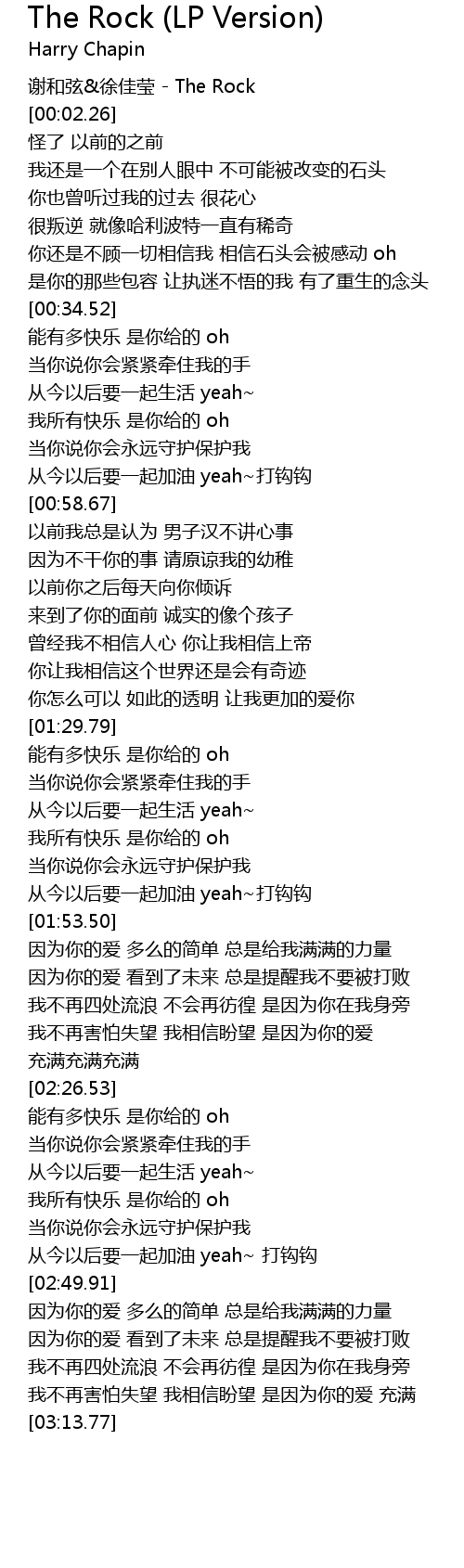 | [00:00.03] | 谢和弦&徐佳莹 - The Rock |