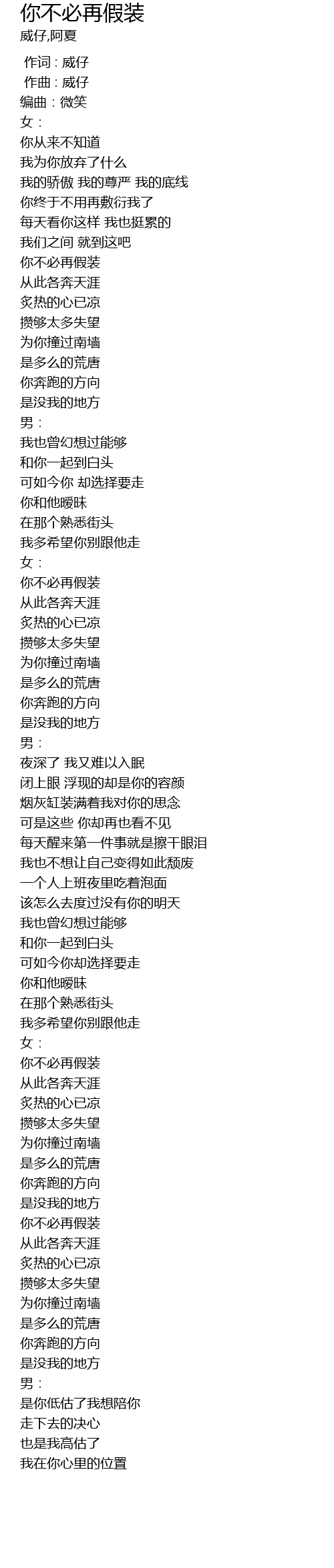 | [01:15.43] | nǐ bù bì zài jiǎ zhuāng |