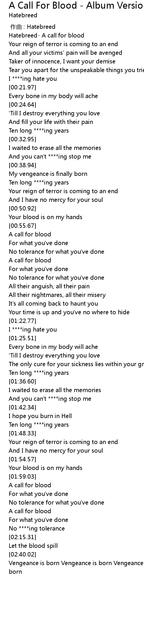 | [02:44.48] | Vengeance is born Vengeance is born Vengeance is born Vengeance is born |