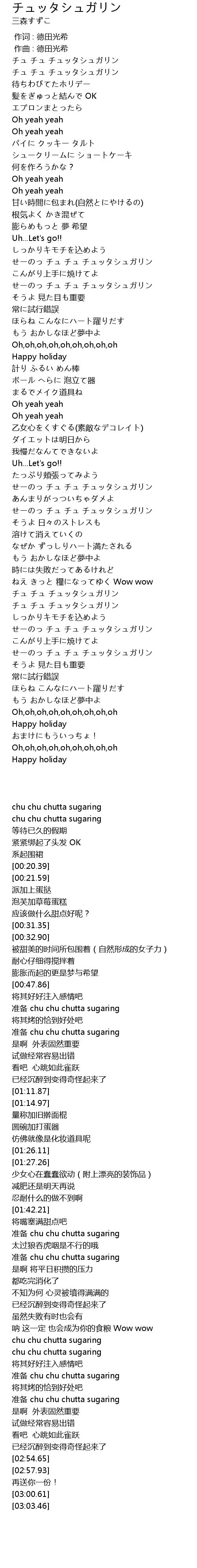 | [00:03.38] | チュ チュ チュッタシュガリン |