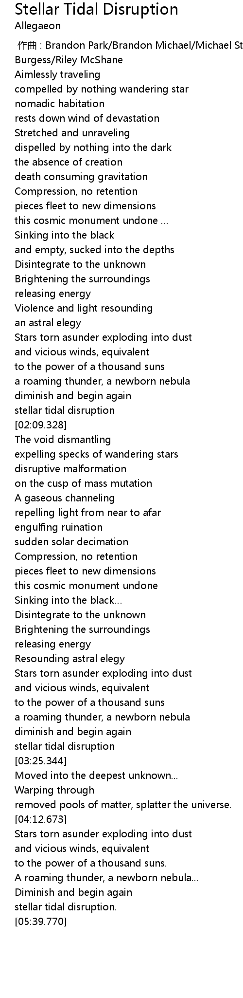 | [05:06.466] | Stars torn asunder exploding into dust |