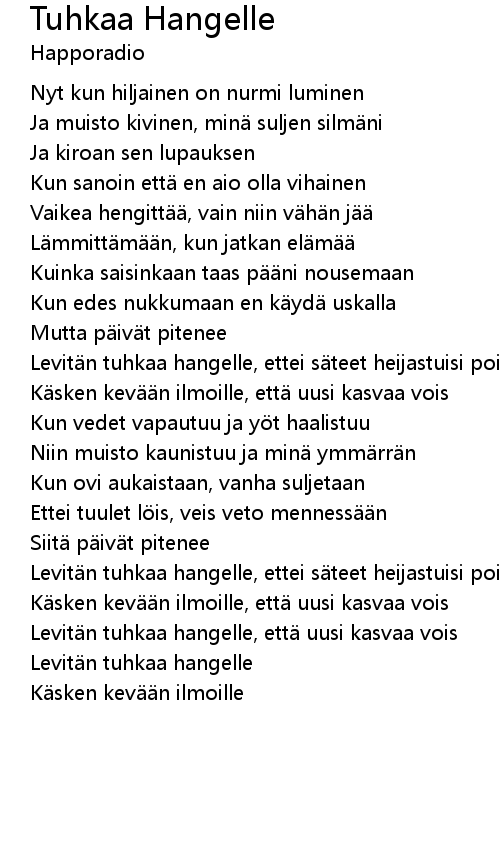 | Levitän tuhkaa hangelle, että uusi kasvaa vois | |
