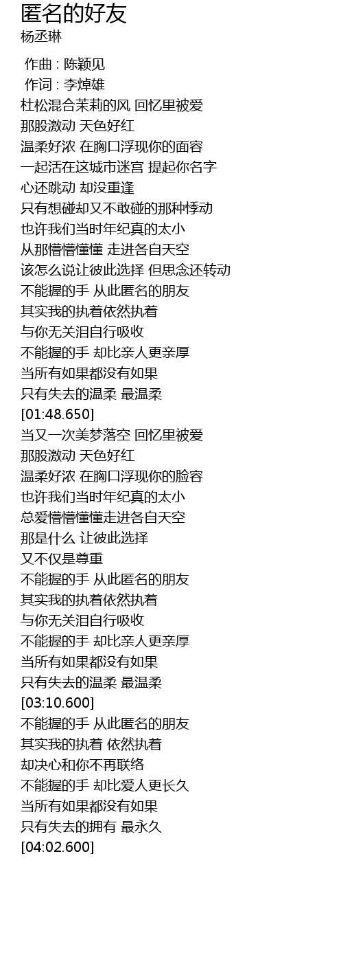 | [03:23.140] | 不能握的手 从此匿名的朋友 |