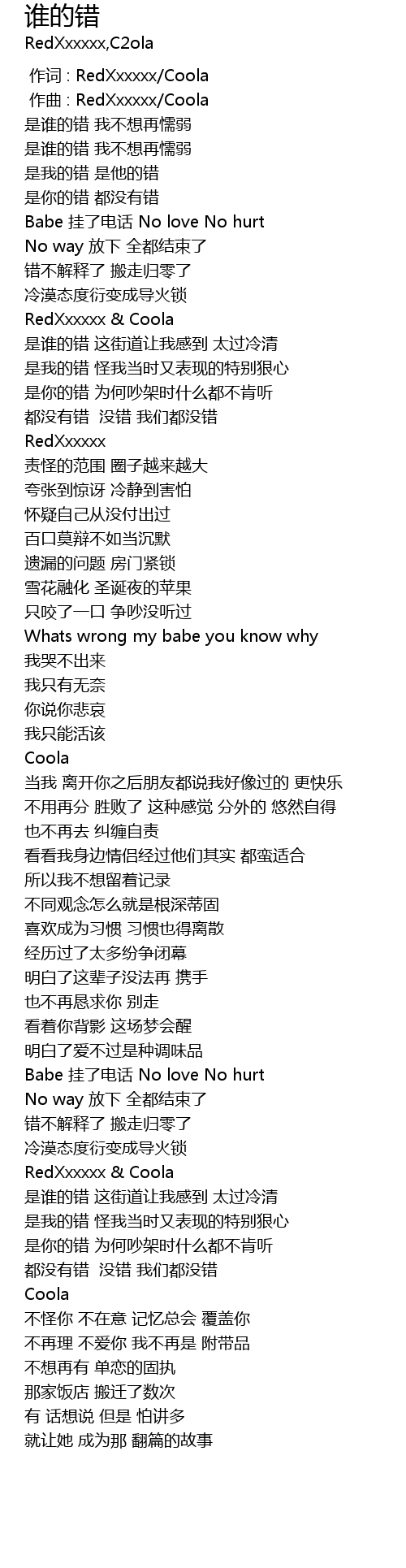 | [00:01.000] | zuò qǔ : RedXxxxxx Coola |
