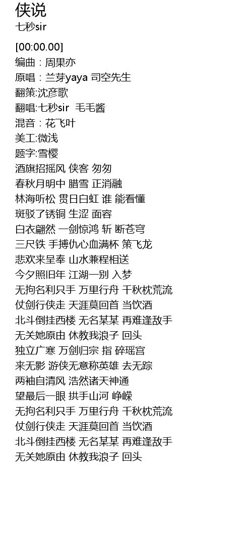 | [01:04.370] | 仗剑行侠走 天涯莫回首 当饮酒 |