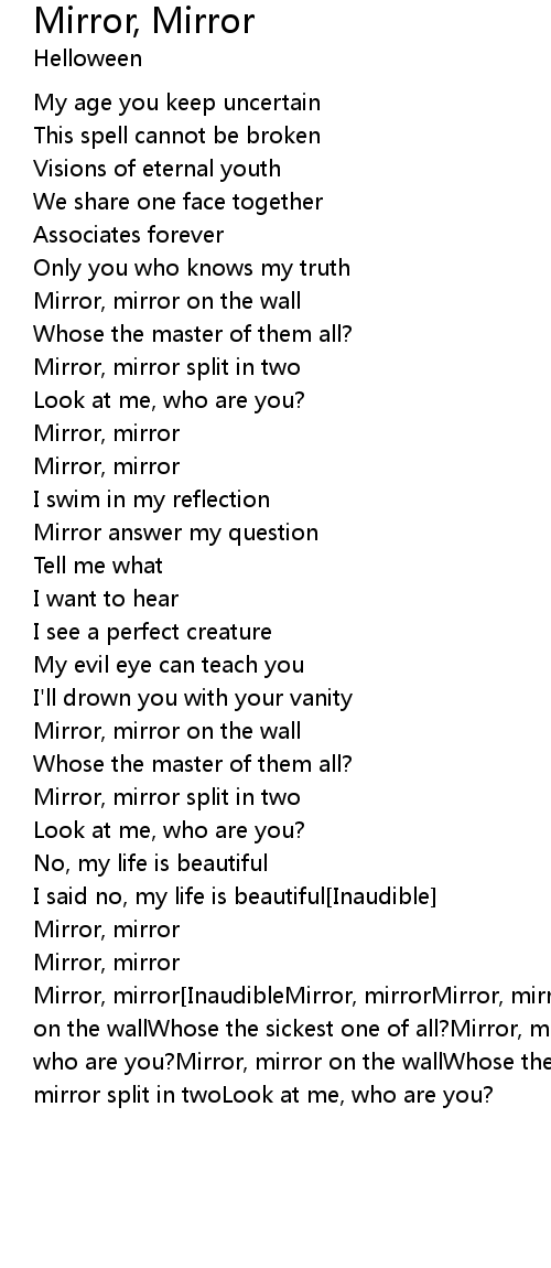 Mirror, mirror[InaudibleMirror, mirrorMirror, mirrorMirror, mirrorMirror, mirror on the wallWhose the sickest one of all?Mirror, mirror split in twoLook at me, who are you?Mirror, mirror on the wallWhose the master of them all?Mirror, mirror split in twoLook at me, who are you? |