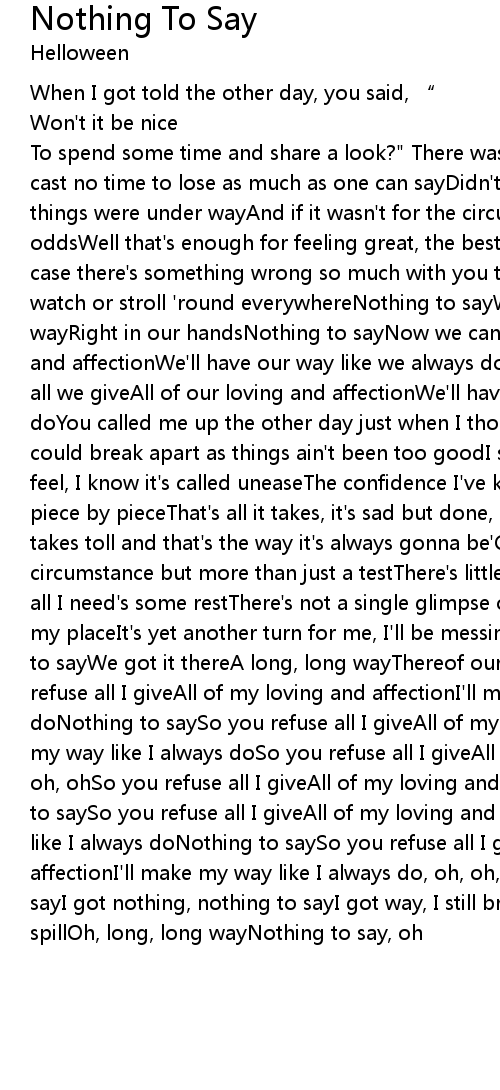| To spend some time and share a look?" There was no thinking twiceThe die was cast no time to lose as much as one can sayDidn' t hesitate to call you back and things were under wayAnd if it wasn' t for the circumstance and well against all oddsWell that' s enough for feeling great, the best we could have gotAnd just in case there' s something wrong so much with you to shareMuch better anyways than watch or stroll ' round everywhereNothing to sayWe got it thereA long, long wayRight in our handsNothing to sayNow we can use all we giveAll of our loving and affectionWe' ll have our way like we always doNothing to sayNow we can use all we giveAll of our loving and affectionWe' ll have our way like we always doYou called me up the other day just when I thought you wouldAnd asked if we could break apart as things ain' t been too goodI swallowed hard and got that feel, I know it' s called uneaseThe confidence I' ve kept so well, just came down piece by pieceThat' s all it takes, it' s sad but done, no way to disagreeTime takes toll and that' s the way it' s always gonna be' Cos it wasn' t yet the circumstance but more than just a testThere' s little left for feeling great and all I need' s some restThere' s not a single glimpse of hope, well, someone took my placeIt' s yet another turn for me, I' ll be messin' ' round everywhereNothing to sayWe got it thereA long, long wayThereof our handsNothing to saySo you refuse all I giveAll of my loving and affectionI' ll make my way like I always doNothing to saySo you refuse all I giveAll of my loving and affectionI' ll make my way like I always doSo you refuse all I giveAll of my loving and affection, oh, ohSo you refuse all I giveAll of my loving and affection, oh, oh, ohNothing to saySo you refuse all I giveAll of my loving and affectionI' ll make my way like I always doNothing to saySo you refuse all I giveAll of my loving and affectionI' ll make my way like I always do, oh, oh, ohI got, I got nothing to sayI got nothing, nothing to sayI got way, I still brave horizonNothing to spillOh, long, long wayNothing to say, oh |